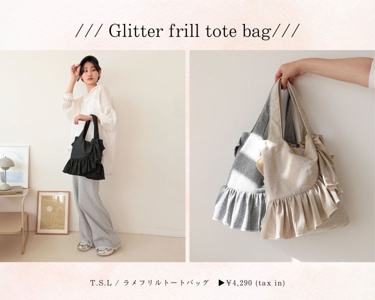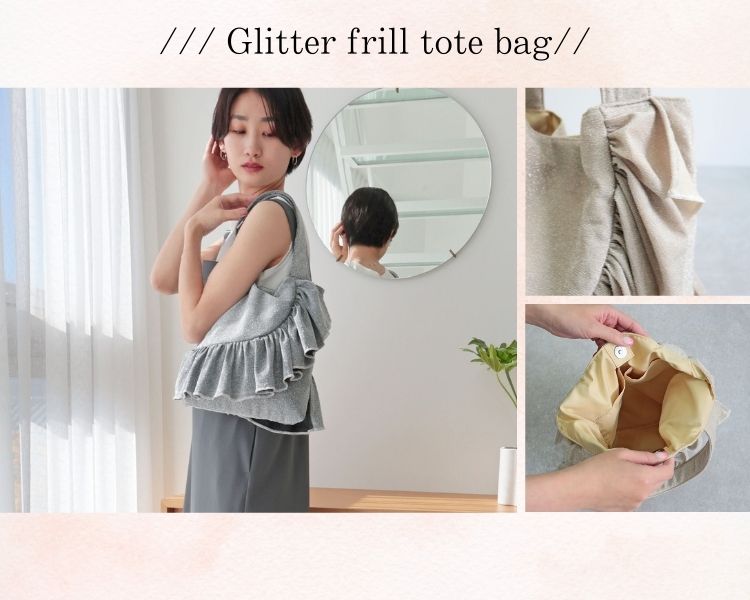 流れるようなフリルが、どこかモードで洗練された佇まいのラメフリルトートバッグ。持つ角度によって表情が変わり、いつもの装いに新鮮なリズムをプラスしてくれます。